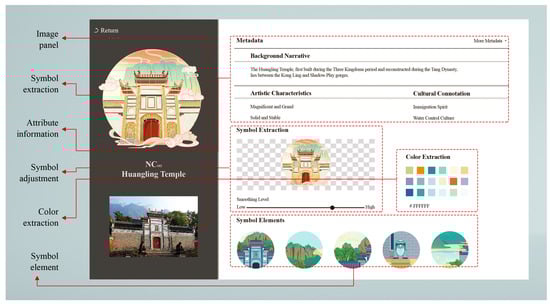 A primary reason for public cognitive bias in the digital era is deficient contextual cultural data. In the thematic cultural experience field, we employ the cultural gene map for the digital management and presentation of cultural heritage knowledge. As shown in Figure 10, we choose typical pictures from the collected dataset as image panels and combine relevant information to decode artistic features, background stories, and contemporary implications. Then, we extract cultural symbols from cultural imagery and image panels and deconstruct the symbols into individual symbol elements that contain cultural implications. Finally, pixelation methods are applied to analyze color images, and the Adobe Illustrator CC 2019 (version 23.1.0, Adobe Inc., San Jose, CA, USA) color picker is used to extract color data, thereby creating a cultural gene map. This map provides a comprehensive description of cultural heritage symbols by multi-dimensional feature linkages, allowing users a digital learning pathway and supplying abundant design elements and structured knowledge for urban renewal projects.