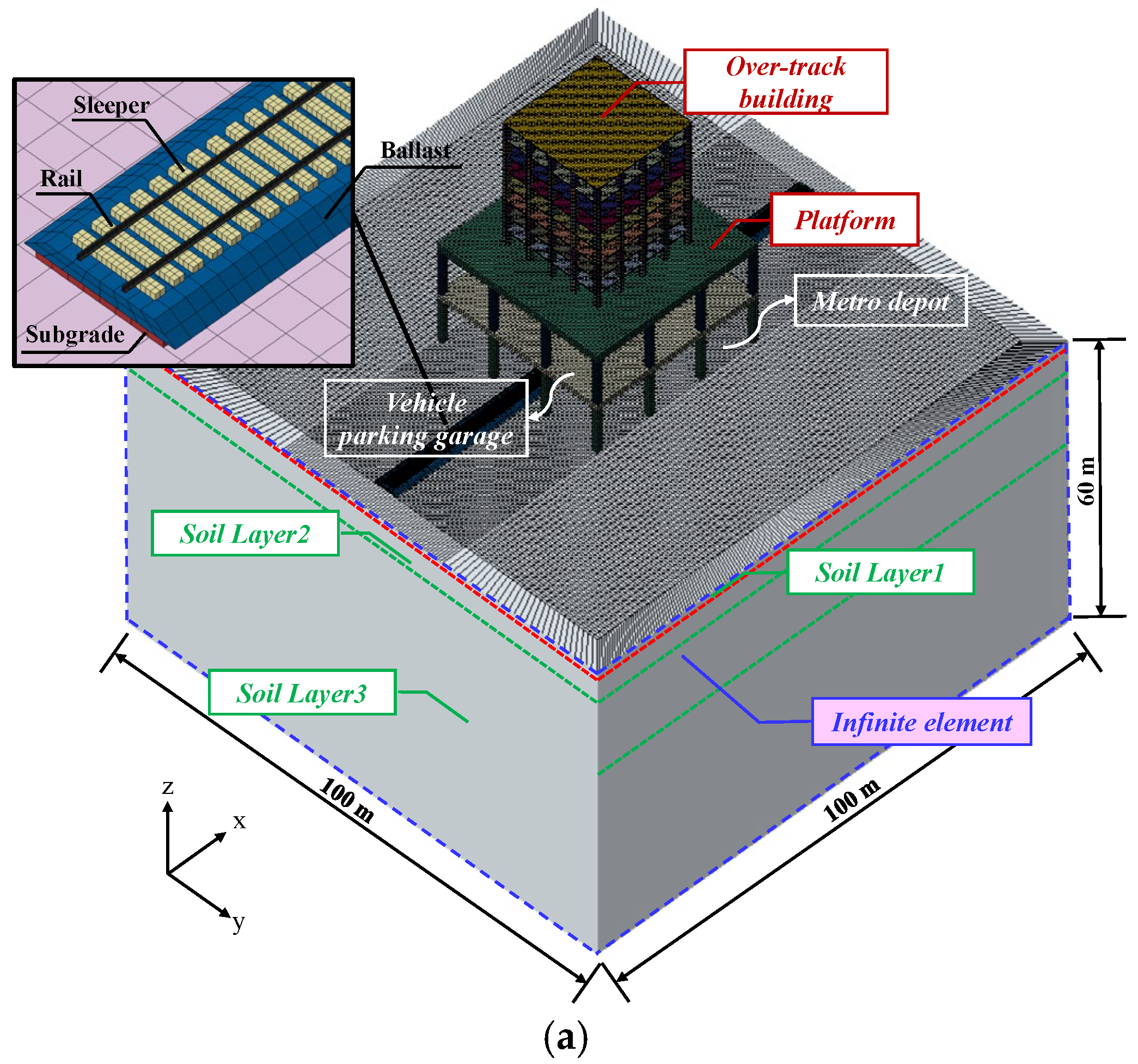 - Li, X.; Chen, Y.; Zou, C.; Chen, Y. Train-induced vibration mitigation based on foundation improvement. J. Build. Eng. 2023, 76, 107106. [Google Scholar] [CrossRef]
