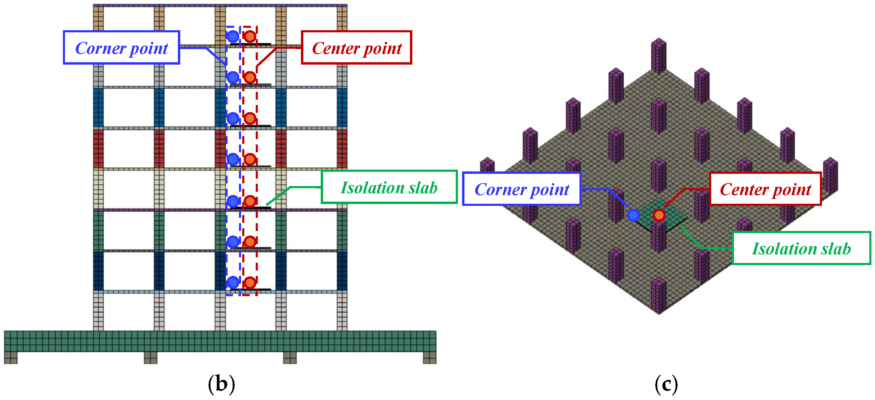 - Parametric FE simulations further elucidated the influence of key parameters. Increasing the number of bearings promotes uniform stiffness, thereby reducing the overall acceleration and mitigating differences between central and corner points. However, the marginal benefit declines beyond 25 bearings. The isolation frequency dictates energy transmission: operation within the 3–5 Hz isolation band minimizes acceleration, rendering the system suitable for acceleration-sensitive applications. Conversely, higher frequencies could shift the system into the amplification zone, significantly elevating acceleration. Higher damping ratios enhance energy dissipation, effectively attenuating transient acceleration and displacement, though they slightly increase steady-state acceleration due to increased transmissibility in the isolation zone.