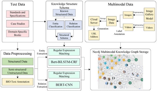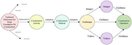 Multimodal knowledge graph technology was provided as a new approach to solving the above problems. This technology integrated text, images, videos, and other diverse data through a structured semantic network, enabling the systematic organization and intelligent reasoning of knowledge. In fields such as healthcare and finance, multimodal knowledge graphs have demonstrated strong capabilities in knowledge integration. For instance, the medical knowledge graph in Google Health connected clinical guidelines, imaging data, and case records, improving diagnostic accuracy by more than 40% []. The medical multimodal relational graph learning method developed by Hu et al. (2024), though targeting the healthcare domain, offers valuable insights for cross-modal relationship modeling in construction scenarios through its interdisciplinary approach []. Meanwhile, Huan et al. (2025) systematically evaluated the application of BIM in elderly care facility management, emphasizing the foundational role of information standardization in multi-source data fusion—a critical consideration equally applicable to data governance in construction knowledge graphs []. However, in the field of construction engineering, particularly in the specialized area of deep foundation pit engineering, the application research of multimodal knowledge graphs was still in its early stages. Existing literature indicated that the intelligence of construction technology disclosure in deep foundation pit engineering still needed improvement, and the construction technology disclosure knowledge for various types of deep foundation pit projects remained in an independent and scattered state. The tasks of knowledge integration and standardization of disclosure knowledge still required faster implementation.