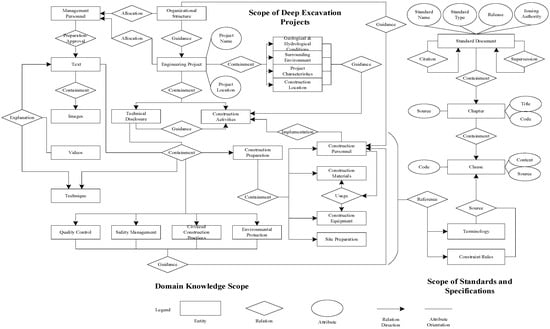This study systematically reviewed technical disclosure cases and standard specification knowledge to construct a classification system for the deep foundation pit construction technology disclosure knowledge domain. This resulted in the formation of a multimodal knowledge structure model tailored for the Technical Disclosure for Deep Foundation Pit Construction (TDFPC) domain. Based on the hierarchical progression of domain knowledge and the analysis of entity concept types, a hierarchical TDFPC multimodal knowledge structure model with an “entity-relationship-attribute” framework was established (Figure 2). In this model, organizations were assigned a guiding role in engineering project construction, while the project itself included basic attributes such as the project name and location, and was further detailed with entity information like geological hydrology and surrounding environment. As a critical component of guiding construction activities, technical disclosure covered multiple aspects, including construction preparation, construction processes, quality control, safety management, civilized construction, and environmental protection. Notably, technical disclosure content included not only textual information but also supported video information, such as using videos to explain construction processes in detail. Specifically, for video data, keyframes were manually extracted and annotated with construction activity labels, which were then aligned with textual process descriptions through temporal segmentation. For BIM elements, IFC component attributes (e.g., element type, location, material) were mapped to corresponding engineering entities based on ID matching and spatial context. These annotations were embedded into the knowledge graph as instances with cross-modal references. The entire knowledge structure model strictly followed the terminological rules and constraint requirements of the standard specifications.
