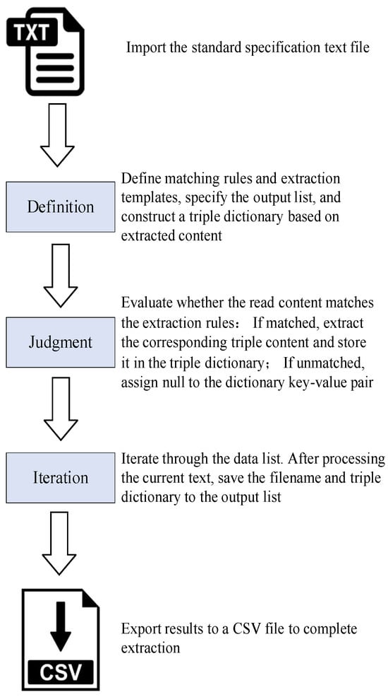 Regular expression template matching was a data extraction technique that began with the formulation of extraction rules. Before extraction, dedicated extraction rules needed to be designed based on the characteristics of the target data. The database was then scanned comprehensively according to these rules to filter out the information that met the criteria. This method was particularly suitable for text types with clear structures and highly consistent expression methods and language styles. For such texts, manual reading and analysis were required to distill the text patterns and construct the corresponding extraction rules. For structured data, the regular expression template matching method was used for entity extraction, which, compared to other methods, demonstrated significant advantages in both accuracy and efficiency. The process of rule-based data extraction was shown in Figure 4.