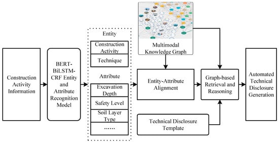 In response to the multi-source heterogeneity of the technology disclosure data and the richness of domain knowledge, a knowledge structure model was designed. Considering the complexity, diversity of formats, and dispersion of construction documents in the deep foundation pit engineering domain, entity, relationship, and attribute knowledge extraction methods with domain adaptability were developed, and a textual knowledge graph was constructed. Through multimodal linking technology, entities from images, videos, and BIM models were connected to the textual knowledge graph, thus forming a multimodal knowledge graph. The specific process was shown in Figure 1. The methodology integrates a domain-specific hierarchical knowledge system structured around the Work Breakdown Sructure (WBS) and national technical standards. Named entities and relations are extracted from multimodal engineering texts using deep learning models such as BERT-BiLSTM-CRF and BERT-CNN. Candidate disclosure cases are retrieved using a hybrid similarity computation based on Jaccard and Word2Vec embeddings. Knowledge inference is performed through multi-hop traversal of a Neo4j-based knowledge graph, enabling the system to extract procedural steps, safety constraints, and material attributes. The inferred content is finally mapped into structured disclosure documents via a rule-driven template mechanism. This end-to-end architecture ensures that raw project information can be automatically transformed into standardized, context-aware CTD plans.