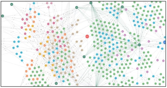 By using the LOAD CSV method to import entities, relationships, and attributes, and exporting the Neo4j graph as a PNG file, the knowledge graph shown in Figure 9 was obtained. In the graph, the unique red node is named “Deep Foundation Pit Engineering Construction Technology Disclosure,” and the six surrounding blue nodes represent entity categories, which are: Project Basic Information, Construction Preparation, Construction Technology, Construction Organization Management, Standard Specifications, and Multimodal. The entire graph contains 803 entity nodes, 1509 entity relationships, and 46 attribute categories.