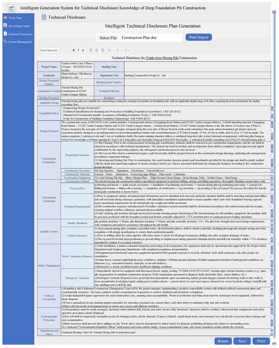 Through the above process, the intelligent generation of the technology disclosure scheme could be achieved, and the dynamic response to changes in the technology disclosure scheme could also be realized. Finally, the inferred and retrieved knowledge was mapped and output according to the designed technology disclosure scheme template, resulting in the generation of the technology disclosure scheme for the target construction activity. To assess the quality of the generated disclosure plans, we adopted both objective metrics and expert evaluation. The average field completion accuracy reached 96.4%, with a knowledge reuse rate of 72.5% and an average generation time of 18.7 s per plan. Semantic consistency with expert-authored templates was measured using cosine similarity, yielding a score of 0.87. Furthermore, three senior engineers independently evaluated the generated plans in terms of completeness, logical coherence, and regulatory compliance, resulting in an average score of 4.42 out of 5. The inter-rater agreement, calculated using Cohen’s Kappa, was 0.79, indicating substantial expert consensus. The results of the intelligent generation based on the multimodal knowledge graph were shown in Figure 10 (image display effect shows two pages combined).