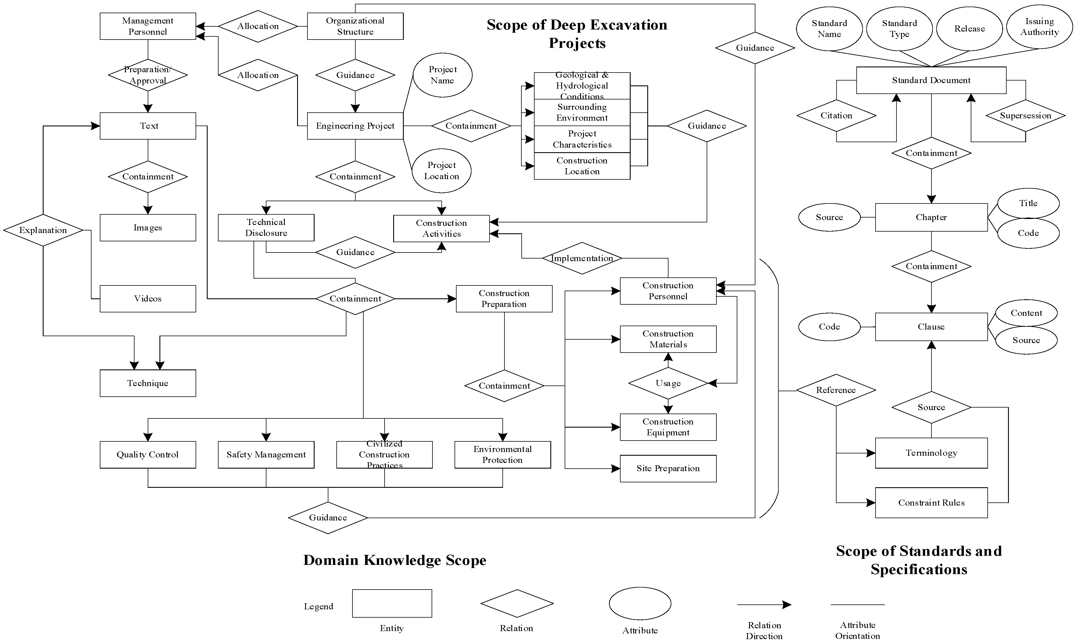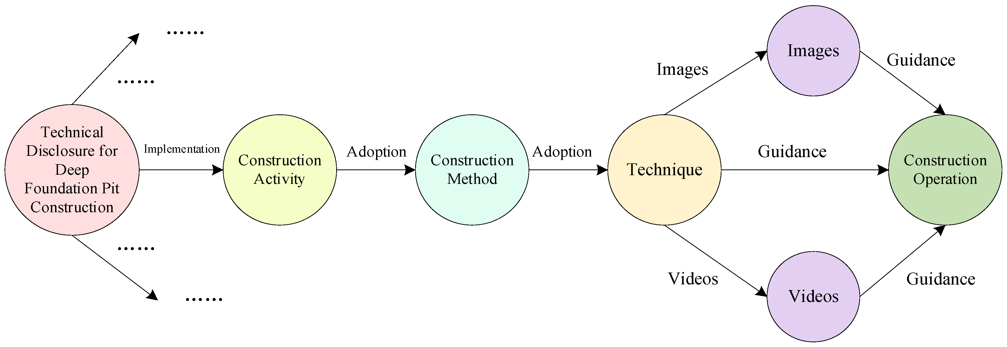 The relevant parameters for the intelligent generation of the technology disclosure scheme came partly from standard specification knowledge in the knowledge graph, which included constraints on quality, construction processes, safety, construction materials, construction equipment, civilized construction, and green construction. Another part came from construction design document information, and the last part came from historical case knowledge. These three sources not only facilitated the intelligent generation of technology disclosure knowledge but also enabled cross-validation, resulting in high attribute accuracy for the intelligent generation of technology disclosure schemes and strong operability. The multimodal knowledge graph based on technology disclosure knowledge could not only intelligently generate traditional document-based disclosure knowledge but also push construction process-related images and technology disclosure videos through graph inference and retrieval, promoting the standardization, acceleration, visualization, and intelligence of deep foundation pit engineering technology disclosure activities.