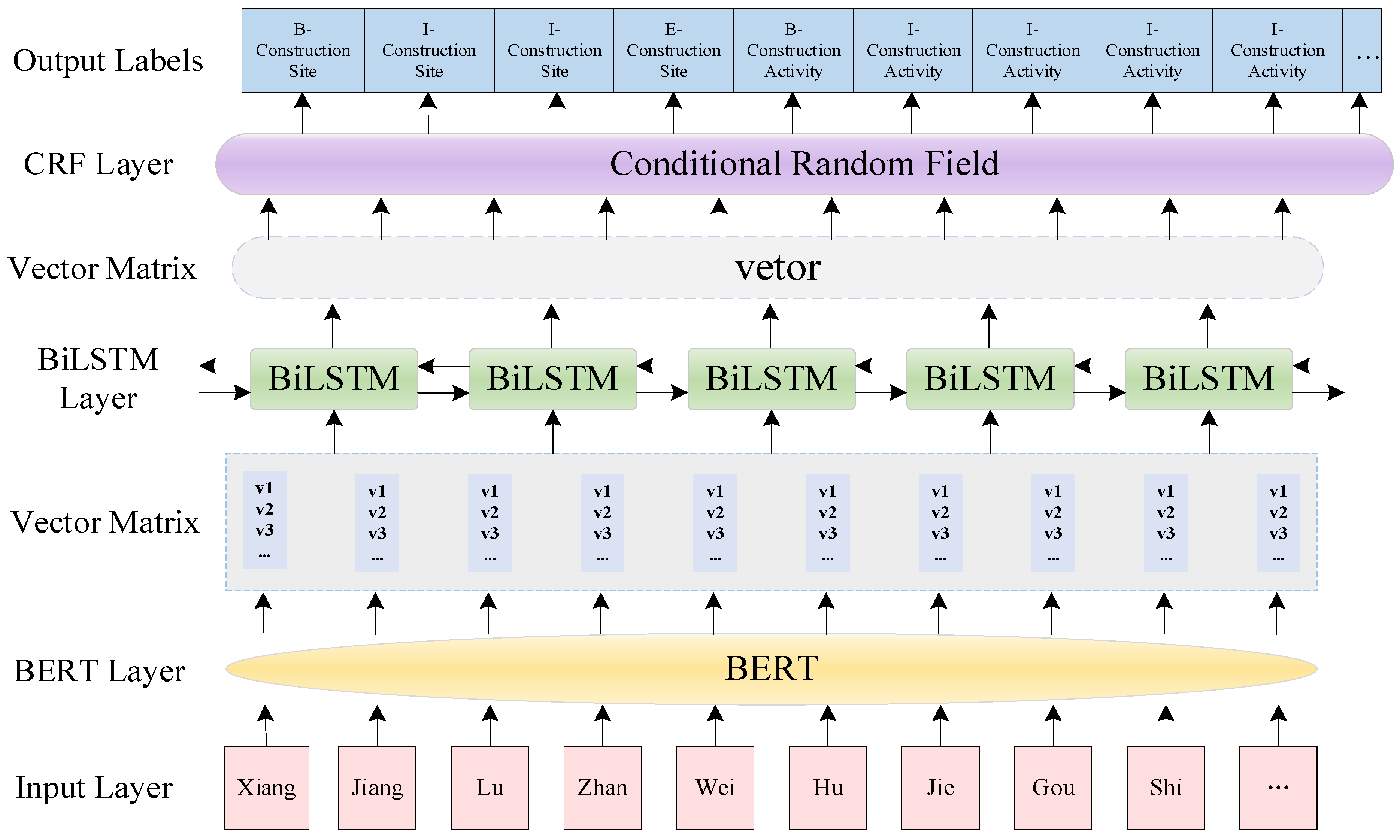 In terms of overall evaluation metrics, the “Construction Preparation” module performed the best (88.16%), while “Environmental Protection” performed the worst (73.25%). The high accuracy and recall group (P > 80%, R > 80%) includes “Project Features” (P = 87.85%, R = 87.64%) and “Construction Preparation” (P = 88.91%, R = 87.43%); the low accuracy and recall group (P < 75% or R < 75%) includes “Geological Hydrology” (P = 73.32%, R = 84.37%), “Surrounding Environment” (P = 74.62%, R = 85.69%), and “Environmental Protection” (P = 73.48%, R = 73.02%). The recall deficiency for “Construction Materials” is due to the diverse ways material specifications are expressed and inconsistent annotation granularity. The low precision and recall for “Environmental Protection” is due to vague descriptions of environmental protection measures or semantic overlap with “Civilized Construction” categories. Further error analysis revealed two recurring patterns. First, many sentences used non-specific phrases (e.g., “appropriate action should be taken”) that lacked domain-grounded technical terms, making it difficult for the model to identify concrete entities. Second, multi-clause sentences often embedded several protection instructions (e.g., dust suppression, noise reduction, waste management) within a single expression, increasing complexity for both boundary detection and relation extraction. These patterns contributed to entity fragmentation and reduced overall extraction accuracy. The feature capture ability for “Safety Management” is weak because safety event descriptions often use negation sentences (e.g., “No over-excavation allowed”), which have complex syntactic patterns. To improve coverage in these two categories, we enhanced the annotation schema with domain-specific examples, such as regulatory phrases and typical safety warnings. For Safety Management, additional training samples containing negation structures were introduced to help the model capture implicit constraints. For Environmental Protection, synonym normalization and rule-based filters were applied to handle semantic ambiguity and overlap with Civilized Construction. These adjustments led to slight improvements in F1-scores in both categories during validation experiments.