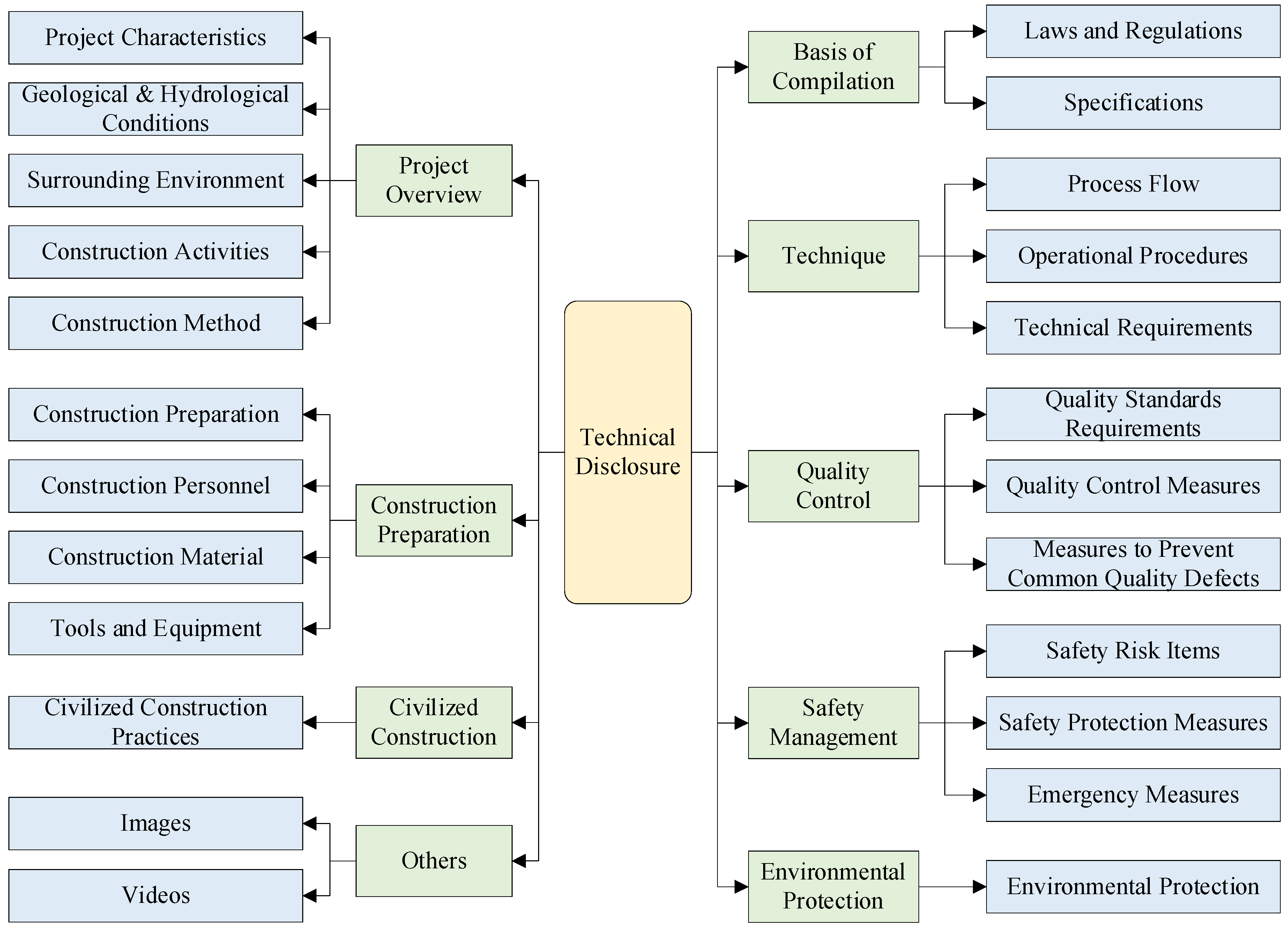 Through the above process, the intelligent generation of the technology disclosure scheme could be achieved, and the dynamic response to changes in the technology disclosure scheme could also be realized. Finally, the inferred and retrieved knowledge was mapped and output according to the designed technology disclosure scheme template, resulting in the generation of the technology disclosure scheme for the target construction activity. To assess the quality of the generated disclosure plans, we adopted both objective metrics and expert evaluation. The average field completion accuracy reached 96.4%, with a knowledge reuse rate of 72.5% and an average generation time of 18.7 s per plan. Semantic consistency with expert-authored templates was measured using cosine similarity, yielding a score of 0.87. Furthermore, three senior engineers independently evaluated the generated plans in terms of completeness, logical coherence, and regulatory compliance, resulting in an average score of 4.42 out of 5. The inter-rater agreement, calculated using Cohen’s Kappa, was 0.79, indicating substantial expert consensus. The results of the intelligent generation based on the multimodal knowledge graph were shown in