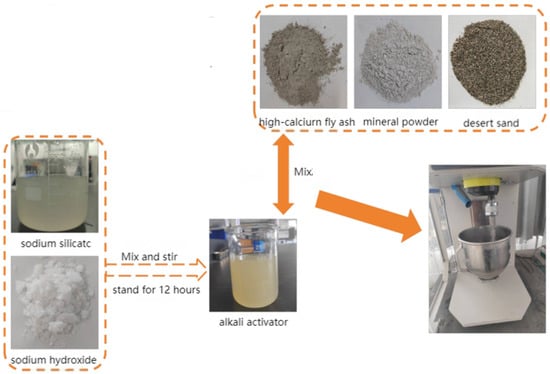 The primary materials used in this study were ground-granulated blast furnace slag (GGBS), high-calcium fly ash (HCFA), Tuokexun desert sand, and alkali activators. The GGBS was an S95-grade mineral powder (white in appearance) sourced from the Huaneng Shang’an Power Plant (Shijiazhuang, China); its technical requirements and performance indices, compliant with GB/T 18046-2017 [36] (ground-granulated blast furnace slag used in cement, mortar, and concrete), are summarized in Table 1. The HCFA was supplied by Henan Xingyang No. 1 Power Plant, Zhengzhou, China. Tuokexun desert sand was collected from an aeolian dune field in Tuokexun County, Turpan, Xinjiang, China (WGS84: g88.51675987,42.57609077). After removing the surface crust, eight sub-samples at 0–20 cm depth along a ~200 m transect were composited and reduced by quartering to ~30 kg, sealed in PE bags, and stored dry. Prior to use the sand was oven-dried at 105 ± 5 °C for 24 h and dry-sieved to remove particles >2.36 mm; no washing was applied., The sand has a bulk density of 1602.5 kg/m3, an apparent density of 2604.5 kg/m3, and a clay content of 0.4%; its fineness modulus of approximately 2.89 qualifies. The composite activator consisted of NaOH and Na2SiO3 solution [37,38]. NaOH (industrial-grade flakes, 98% purity) was procured from Xinjiang Zhongtai Chemical Co., Ltd. (No. 39, Yangchenghu Road, Urumqi Economic and Technological Development Zone, Xinjiang, China). The Na2SiO3 solution (Na2O content of 8.2%, SiO2 content of 26.4%, solids content of 35%, modulus 3.12) was supplied by Xinjiang Qihang Aqueous Glass Technology Co., Ltd., Qinhuangdao, China. The preparation procedure for the alkaline activator is shown in Figure 1. Compressive specimens were cast as sets of three 150 mm cubes, and flexural specimens were standard prisms (150 × 150 × 550 mm; width × height × length), three per set, in accordance with GB/T 50081 [39]. Curing temperature (60, 70, 80, or 90 °C) and curing duration (8, 12, 16, or 20 h) were varied to evaluate the development of flexural and compressive strengths at 3, 7, and 28 days for alkali-activated fly ash composite cementitious materials with different FA or HCFA contents under different curing regimes.