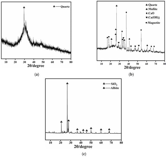XRD spectra of GGBS, HCFA, and Tuokexun desert sand: (a) GGBS, (b) HCFA, and (c) Tuokexun desert sand.
