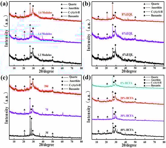 XRD plots of composite cementitious materials with 20% HCFA: (a) −8% alkali equivalent at different moduli for 28 d; (b) modulus 1.2 at different alkali equivalents for 28 d; (c) moduli at different ages; and (d) moduli at different amounts of HCFA for 28 d.