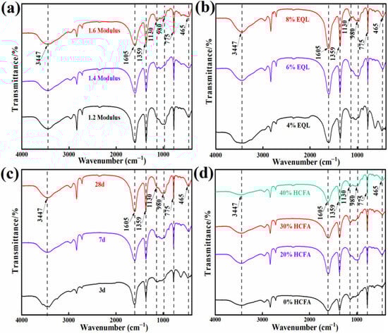 FTIR of composite cementitious materials with 20% HCFA: (a) −8% alkali equivalent at different moduli for 28 d; (b) modulus 1.2 at different alkali equivalents for 28 d; (c) moduli at different ages; and (d) moduli at different HCFA amounts for 28 d.