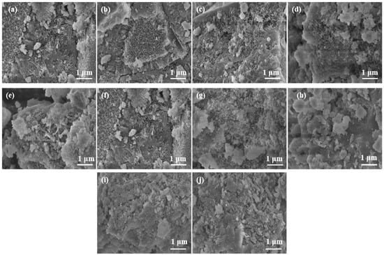 Figure 6 shows the microscopic morphology changes in GGBS/HCFA under different conditions and at different ages. Figure 6a,b,g show the gel C-S-H/C-(A)-S-H product sample under different moduli of hydration: the 1.4 modulus is close; the 1.6 modulus can still observe incomplete hydration reactants. In the system with the aqueous glass modulus, the number of microcracks in the system gradually increased; in particular, when the aqueous glass modulus was 1.6, the number of cracks in the system was significantly increased and the cracks were wider. However, combined with the mechanical properties, these microcracks did not significantly affect the fracture resistance strength. No obvious spherical morphology of HCFA was found in the figure, indicating that the silica–aluminum raw material in HCFA has been dissolved under different modes; Figure 6c,d,g show that the system is well hydrated at 4%, 6%, 8%, and 8% alkali equivalents, but there are still microcracks on the surface. Due to the high content of CaO in HCFA and the 4% base equivalent, OH-binding to Ca2+ in the system can indirectly provide a good alkaline environment for the hydration reaction, so the system can still be effectively stimulated at a lower base equivalent. At a 6% base equivalent, the OH− is sufficient, combined with the mechanical properties of the performance. This base equivalent is better for stimulating the system; when the base equivalent increases to 8%, the high concentration of OH- inhibits the hydration reaction, resulting in less generated gel products. The compressive strength is therefore reduced. Figure 6e–g show that the 3 d and 7 d samples were observed at 3 d and 7 d; however, some of the silica–aluminum matrix is not involved in hydration or occurred at 28 d. Without obvious gaps and cracks in the microscopic morphology, a large number of C-(A)-S-H gel structures can be observed: the substrate is more dense, with more intense wrapping. Figure 6g–j indicate that when HCFA incorporation is increased, HCFA particles in the system gradually decrease with increasing GGBS content; no HCFA spherical particles appeared, showing that GGBS can promote HCFA dissolution. In addition, when HCFA incorporation is reduced, the sample matrix gradually becomes dense, and the hydration products change to a certain extent, forming massive or granular C-(A)-S-H gels on the surface [51]. At 8% alkali equivalent, excess OH− and soluble silicate shift the system to a fast-dissolution/slow-precipitation regime: OH− lowers Ca2+ activity and keeps silicate highly deprotonated, raising the nucleation barrier for C-(A)-S-H; silica/alumina-rich passivation rims form on GGBS/HCFA particles, and higher ionic strength/viscosity slows ion transport. As a result, effective supersaturation, nucleation density, and gel connectivity decrease, microcracking/porosity increase, and the overall degree of hydration is lower than at 6%, and compressive strength drops despite similar phase types.
