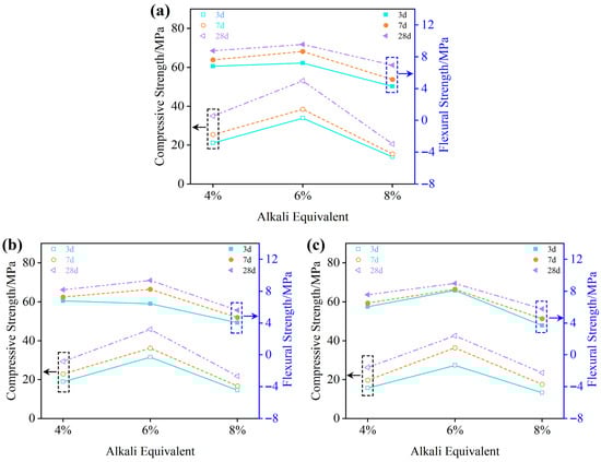 Effect of the aqueous glass modulus and alkali equivalent on the flexural and compressive strength of AACMs with 20% HCFA: (a) aqueous glass modulus 1.2; (b) aqueous glass modulus 1.4; and (c) aqueous glass modulus 1.6.