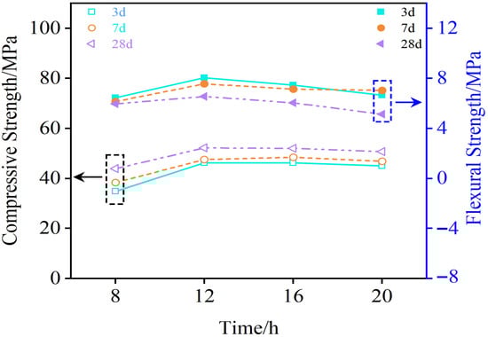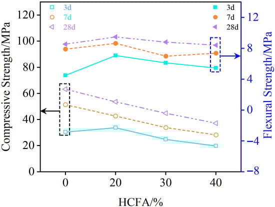 According to the above test design and test results, the optimal ratio combination was selected to design the parameters such as HCFA mixing amount (40%, 30%, 20%, and 0%), curing temperature (60 °C, 70 °C, 80 °C, and 90 °C), curing time (8 h, 12 h, 16 h, and 20 h), etc., and analyze the change rules of flexural strength and compressive strength of alkali-activated composite cementing materials in different HCFA content mixtures after 3 d, 7 d, and 28 d under different curing systems.