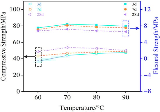 Figure 9 shows the specimen in steam curing at the same period, and after switching to normal curing after 28 d, its compressive strength and flexural strength increase and then drop as the curing temperature increases. After steam curing at 60 °C, 70 °C, 80 °C, and 90 °C, the compressive strength of 28 d rose by 32.8% and 21.9%, which are increases of 13% and 6.4% compared to 3 d. The lower the temperature, the greater the increase. At 70 °C, the compressive strength after 28 d achieved 53.4 MPa, which is somewhat greater than the normal curing strength for 28 d. The compressive strength increased to 53.4 MPa at 70 °C at 28 d. At 60 °C, the Al-O and Si-O monomers failed to completely disassemble, with low dissolution rates of aluminate monomers in GGBS and HCFA, and insufficient precursors for polymerization reactions, which eventually led to low initial compressive strength at this temperature. The flexural strength of the sample increased first and then decreased with the increase in temperature, with a peak at 70 °C, with values of 8.4 MPa at 3 d and 7.2 MPa at 28 d, reducing by about 14.3%. This shows that the folding resistance in the initial hydration reaction is higher than in the later period. At 70 °C, the flexural strength at 28 d was reduced by about 24.2% compared with the strength at 28 d under standard maintenance, with a large decrease. The high curing temperature can increase the compressive strength of the sample in a short time, but cannot make the antiflexural strength reach the optimal value under standard curing.