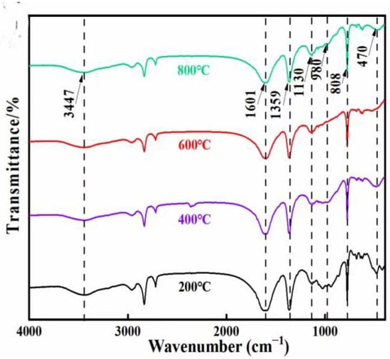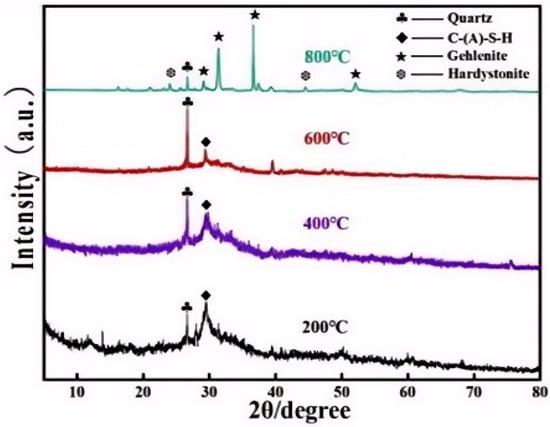 Figure 11 shows that the diffraction peaks of the hydration products are basically the same before and after the test at a high temperature of 200 °C, and there is no obvious phase transition. However, the diffraction peaks undergo a phase transition after the test at 400 °C, the C-(A)-S-H peaks are weakened, and the quartz diffraction peaks are strengthened, and the change in the diffraction peaks is more obvious after the test at 600 °C. With the exposure temperature increased to 800 °C, the system exhibited calcium aluminum yellow (Ca2Al(AlSi)O7) and zinc yellow crystal phases (Ca2ZnSi2O7), two new crystals, and the formation of C-(A)-S-H gel crystallization; therefore, a sharp diffraction peak at 2θ = 31° corresponding to the C-(A)-S-H peak or the amorphous “hump” completely disappeared, indicating that C-(A)-S-H was completely decomposed or crystallized, thus the structure was destroyed during the phase transition.