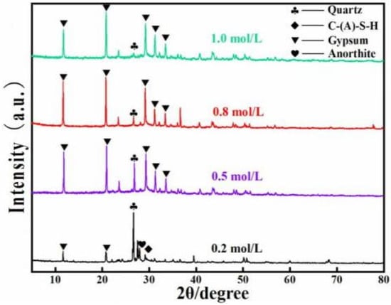 After immersing the alkali-activated GGBS/HCFA composite cementitious material in acid for a duration of 28 d, the diffraction peak of the hydration product C-(A)-S-H vanished and the CaSO4 diffraction peak formed, as shown in Figure 12. The CaSO4 diffraction peak becomes stronger as the concentration of H2SO4 increases, whereas the strength of the SiO2 diffraction peak slowly declines. This is because sulfuric acid interacts with C-(A)-S-H to produce CaSO4, and the higher the concentration of sulfuric acid, the more CaSO4 is produced, which precipitates on the surface of SiO2, decreasing the SiO2 diffraction signals.