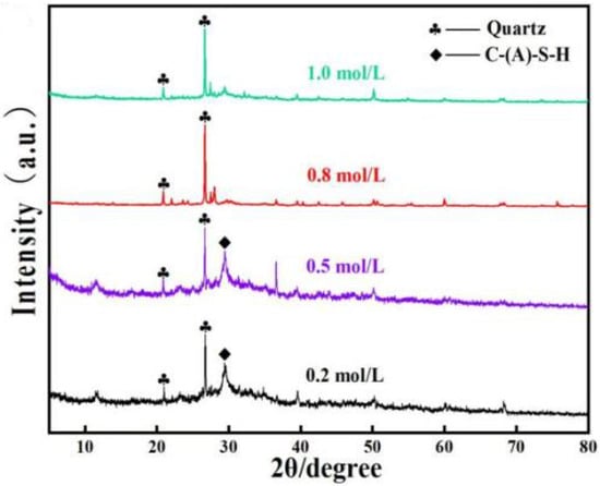 Figure 13 shows that a small quantity of OH- has no obvious erosion effect on the specimens of the alkali-activated GGBS/HCFA composite cementitious material, which is related to the presence of a large amount of OH- in the system; as the concentration of OH- increases, the specimens’ hydration product C-(A)-S-H gel is eroded, and the erosion is more severe at 0.8 mol/L. Combined with the mechanical properties, the specimens’ strength reduced as the OH- concentration increased, although there was no continuous decrease, which was related to the depth of alkali erosion.