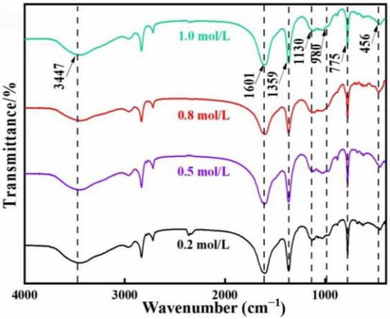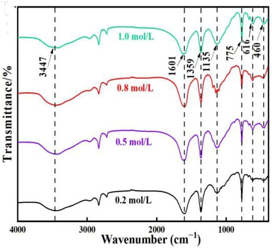 Figure 15 demonstrates that the alkali-activated material combines with C-(A)-S-H to capture Ca2+ to create gypsum due to the presence of SO42− at various H2SO4 immersion concentrations, and the gypsum products rise as the H2SO4 concentration increases. Figure 15 indicates an increased absorption peak at 1135 cm−1 associated with SiO2, implying that the conversion of C-(A)-S-H to SiO2 is linked to CaSO4. The alkali-activated GGBS/HCFA composite cementitious material exhibited a distinctive peak of SO42− at 616 cm−1, which became stronger with increasing H2SO4 concentration, corresponding with the XRD data.