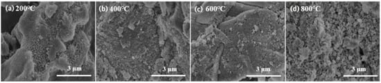 Figure 17 shows the microscopic morphology after alkali activation of the GGBS/HCFA composite adhesive material at high temperature. When the temperature rises to 200 °C, the dense silica–aluminate mesh structure forms on the surface of the material. Because of the desorption of adsorbed water and a very tiny number of pores, the material’s performance does not significantly decline. At 400 °C, the inside of the material has changed significantly and the removal of the C-(A)-S-H binding water causes more holes inside; at this temperature, the intensity decreased significantly. At 600 °C, the material changes significantly and exhibits a high number of hollow structures, which is due to the fact that the hydration products begin to shrink after dehydration and the C-(A)-S-H begins to break down, resulting in the material’s dissolution. Small and wide fractures can also be detected in the material, showing discontinuities caused by damage from pore pressure and thermal stresses, the slow disintegration of the gel, and the formation and expansion of larger cracks along the margins. Cracks typically form around the interfacial transition zone between unreacted particles and reaction products, expanding and localizing at relatively weak interfaces, resulting in a significant loss of material strength. In Figure 17d, at 800 °C, the gelation products continue to dissolve by C-(A)-S-H, the crack width widens, and the thick structural layer is severely degraded, resulting in continual internal structure shrinkage, gel material breaking, and the formation of larger holes. The samples were mounted on aluminum stubs with carbon adhesive tabs, air-dried, and coated with [10] nm carbon using a [carbon coater model] (to avoid Au/Pd peaks during EDS). SEM imaging was performed on a Hitachi S-4800 at [5 kV] and [10 mm] working distance (SE detector, high vacuum).