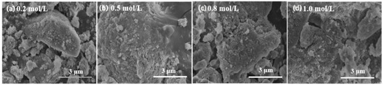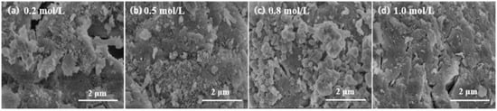 Figure 19 shows the microscopic morphology of the alkali-activated GGBS/HCFA composite material NaOH for 28 d, with the smaller cracks in the low concentration of NaOH solution with increasing concentration. At the NaOH concentration of 0.8 mol/L, the sample hole is clearly visible, the erosion effect is greater than the activation effect, and the mechanical properties of the material decrease with the increase in NaOH concentration and age.
