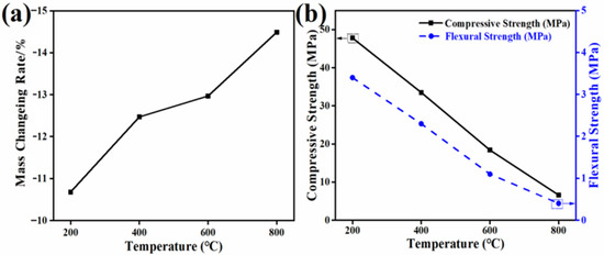 The specimens were placed in a muffle furnace at 200 °C, 400 °C, 600 °C, and 800 °C for high-temperature testing. The muffle furnace was heated at a rate of 15 °C/min. After 2 h, the furnace was closed and cooled to room temperature before being removed. The rate of change in mass and flexural compressive strength was tested.
