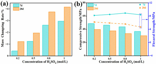 Rate of mass change, flexural strength, and compressive strength of the alkali-activated GGBS/HCFA composite with H2SO4 concentration: (a) mass rate of change; (b) flexural strength and compressive strength.