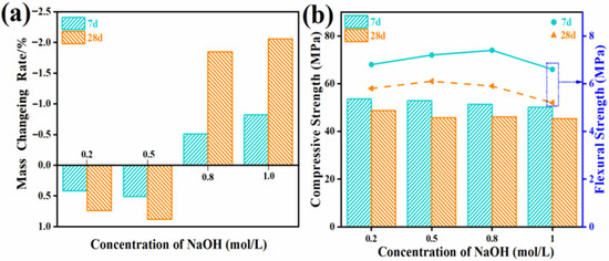As can be seen in Figure 22 above, when the NaOH concentration is lower than 0.5 mol/L, the mass increases with the increase in the concentration. There is mass loss in the high concentration of NaOH solution, and the greater the concentration, the greater the mass loss rate. In the concentrations of 0.2 mol/L, 0.5 mol/L, 0.8 mol/L, and 1.0 mol/L NaOH solution, the 28 d mass change rates were 0.74%, 0.88%, −1.85%, and −2.06%, respectively; in different NaOH solution concentrations, the 28 d age compressive strength decreased. The NaOH concentration was 0.2 mol/L, demonstrating the smallest decline, which was a decrease of about 7.77%; the 28 d age flexural strength showed an upward trend. This is due to the fact that the material itself has a high alkalinity, and the silica–aluminum raw material is not eroded in lower concentrations of NaOH solution. Additionally, because there are some voids inside the specimen, NaOH will fill the voids, resulting in an increase in the mass of the specimen, and the mass increases with NaOH concentration [53]. As the concentration increases, the alkalinity inside the specimen is exceeded, causing the gel material to erode and disintegrate, resulting in mass loss. The decrease in compressive and flexural strength with time in NaOH solution is caused by the ion exchange of some of the C-(A)-S-H with NaOH, resulting in N-A-S-H with decreased strength [54]. Alkali activation of the GGBS/HCFA composite cementitious material’s alkali resistance in high-alkaline environments can also be excellent.