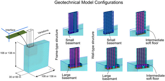 Overview of structural model configurations and the geotechnical model size (left). Top row, from left to right: frame-type structure with small basement (Frame-SB), wall-type structure with small basement (Wall-SB), and wall-type structure with small basement and soft intermediate floor (Wall-SB-SF). Bottom row, from left to right: frame-type structure with large basement (Frame-LB), wall-type structure with large basement (Wall-LB), and wall-type structure with large basement and soft intermediate floor (Wall-LB-SF).
