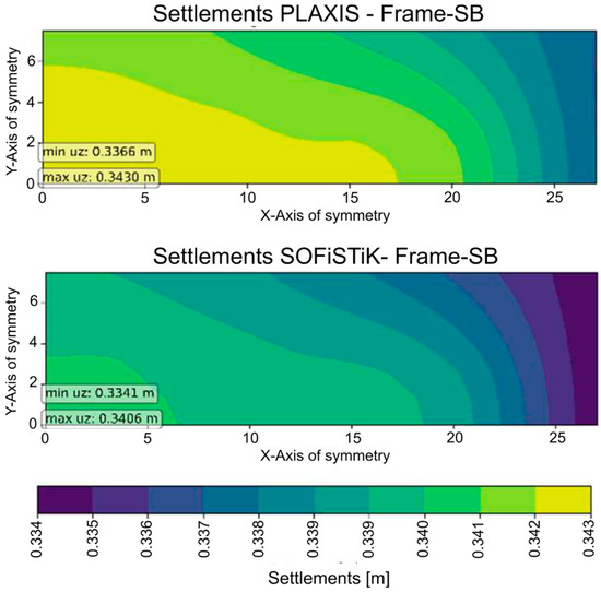 Extensive validation was carried out by comparing settlement results from the SOFiSTiK model and the PLAXIS model under identical boundary conditions and soil properties. As shown in Figure 2, the deviation in vertical displacements between the two simulations is less than 1%, indicating that the PLAXIS model captures the global structural stiffness with sufficient accuracy for the intended analyses.