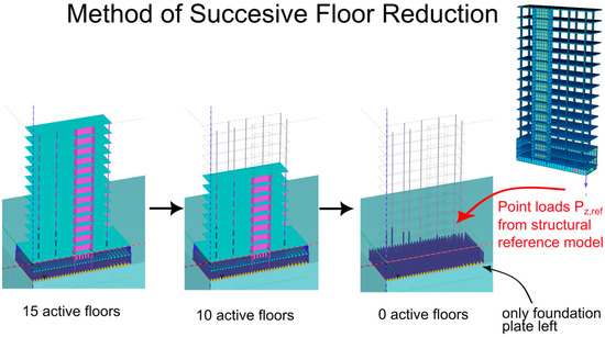 Method of successive reduction of active (massless) floors for the investigation of contributing floors under constant load (point loads from structural reference model).