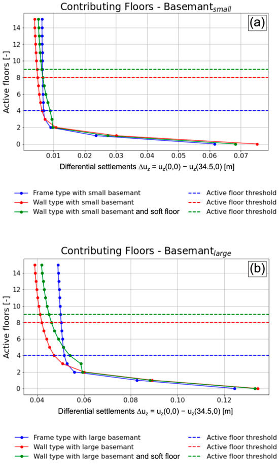 Contributing floors analysis for small basement (a) and large basement (b) wall-type, frame-type, and intermediate soft floor models including the suggested threshold value for active participation.