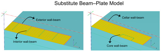 The so-called beam-and-plate model proposed by Werkle and Slongo [34] provides a fast and effective procedure for incorporating wall stiffness into settlement analysis. The core idea is to replace the load-bearing walls of a building, those rigidly connected to the foundation slab, with equivalent vertical beam elements (Figure 5). These beam elements are assigned the same cross-sectional and material properties as the original walls.