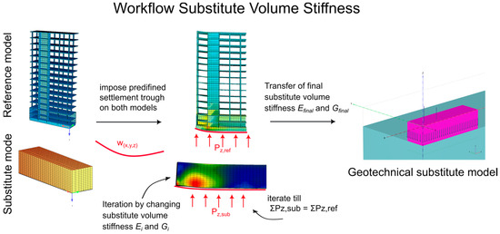 In practical application, the substitute volume is generated in parallel to the full 3D reference model. As described in Figure 6, a predefined settlement trough based on field data or synthetic input is then imposed on both models. The material parameters of the substitute volume are iteratively adjusted until the sum of the resulting support reactions matches that of the structural reference model. Once calibrated, the resulting material properties can be transferred to the geotechnical model and used for further settlement analysis.