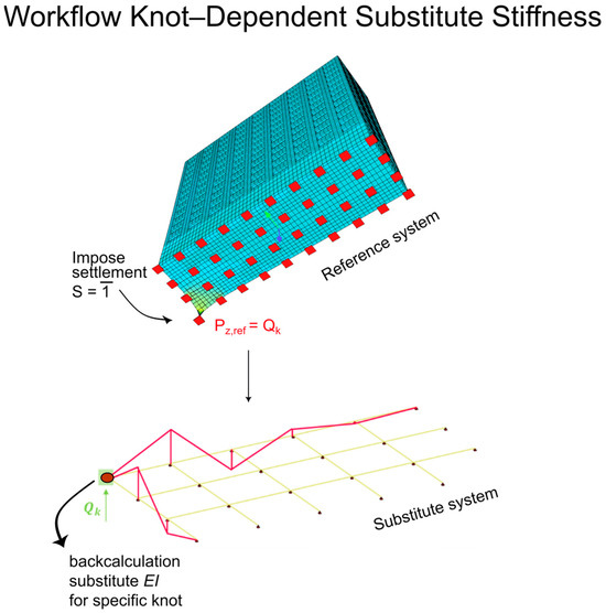 The approach introduced by Sommer [36] calculates the substitute bending stiffness by applying the force method. The technique enables the determination of a node-specific substitute stiffness by imposing a unit displacement at each support node. From this, an equivalent substitute thickness can be derived.