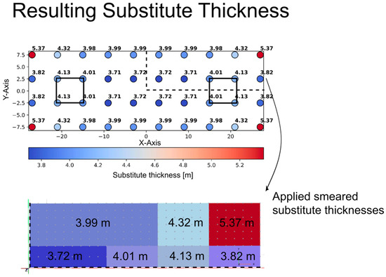 This calculation is performed successively for each support node, resulting in a distributed map of substitute bending stiffness values across the slab. These stiffnesses are subsequently converted into equivalent substitute slab thicknesses. An example of this thickness distribution for a frame-type structure is shown in Figure 8. The location of the structural cores is clearly identifiable by locally increased substitute thicknesses (e.g., 4.01–4.13 m), illustrating the spatial variation in structural stiffness.