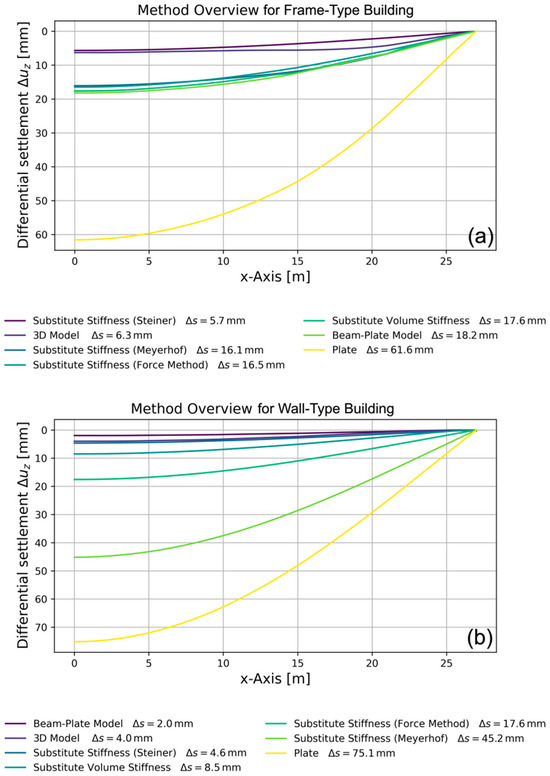 To evaluate the influence of different modeling approaches on the simulation of structural stiffness in geotechnical settlement analyses, several methods were tested and compared. Figure 9 provides an overview of the resulting differential settlements for both wall-type and frame-type buildings, using various simplifications and modeling strategies.