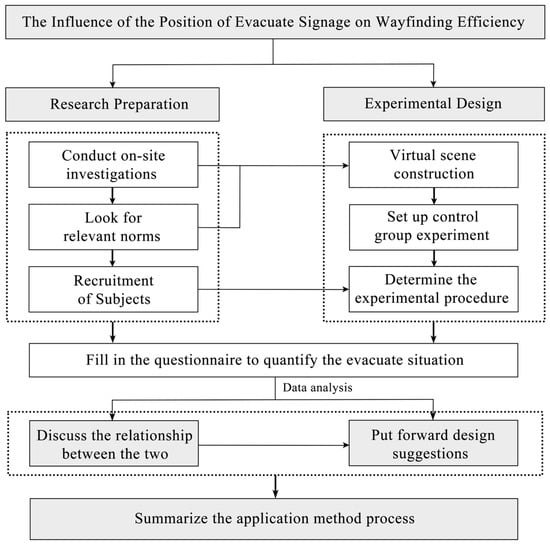Researchers conducted a survey of subway stations in Qingdao, Shandong Province, systematically collected and categorized various types of spatial configurations. At the same time, the researchers comprehensively reviewed relevant standards for architectural design and fire safety and then used modeling software and VR technology to build an experimental scenario that closely matches the real environment. Based on statistical principles, researchers reasonably planned the experimental groups and formulated detailed and scientific experimental procedures. Participants were recruited extensively from among university students and guided to complete the experiment in an orderly manner. After the experiment, SPSS 27.0 was used to conduct validity testing and quantitative analysis on the collected raw data in order to thoroughly investigate the differentiated impact of evacuation signage positions on passengers’ wayfinding efficiency. The detailed methodological steps are shown in Figure 1.