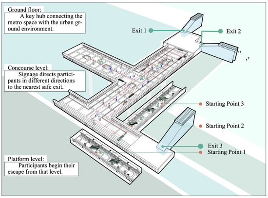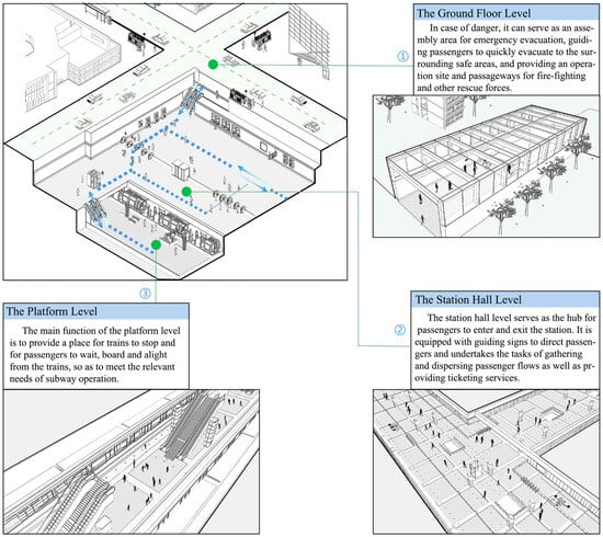 The concourse level and platform level, as core areas with frequent changes in passenger flow behavior, are key areas of focus when planning the position of evacuation signage. In the daily operation of subway stations, the concourse level serves as a connection between the ground level and the platform level. These three spaces together constitute the scope of this study, as shown in Figure 2.
