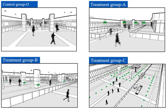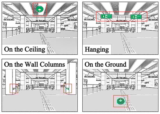 As shown in Figure 7, the final experiment was divided into four groups: Group-O (control group), Group-A (hanging), Group-B (on the wall column), and Group-C (on the ground). Considering that smoke may be generated due to a sudden fire when actual danger occurs, which may affect the visibility of evacuation signage [13], the researchers adjusted the brightness of the evacuation signage in the experiment to 50% of normal brightness, as referenced from Chen et al. Chen et al. also demonstrated that green and black are the most suitable colors for safety signage, as this combination is highly effective for evacuation signage, has low cognitive load, and is more easily visible [14]. Therefore, the researchers set the evacuation signage colors in this study to green and black. All evacuation signages are placed in accordance with the requirements of China’s Code for Fire Protection Design of Metro (GB 51298-2018) [15] and Code for Fire Safety of Buildings (Part 1: General Requirements, GB 13495.1-2015) [16], and International Organization for Standardization (ISO) standards. Both Chinese and international standards require that signages be placed in conspicuous positions that are not easily obstructed.