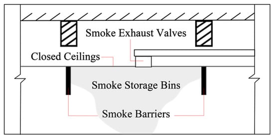 In the experiment, researchers listed the positions of evacuation signage in order from top to bottom according to visual habits. As indicated by the red box in Figure 3: on the ceiling, hanging, affixed to walls and columns, and placed on the ground. However, in real subway stations, in order to effectively suppress smoke diffusion in the event of a fire and buy more time for people to evacuate safely [11], smoke barriers are usually installed on the ceilings, as shown in Figure 4. Furthermore, the smoke generated by a fire can easily obscure evacuation routes and signage, causing people to become disorientated. In light of this, evacuation signages are not installed on the ceiling of subway station in actual operation, so this position is excluded.