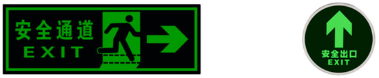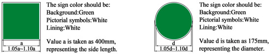 Then, the researchers selected typical signage styles corresponding to the height range in real-world scenarios and set the side length a of the square signage to 400 mm and the outer diameter d of the circular signage to 175 mm in accordance with the specifications. Their sizes and colors are shown in Figure 8. The rectangular and circular signages used in the final model are shown in Figure 9. The rectangular signage can be regarded as three square symbols joined together in accordance with the specifications. The regulations also stipulate that signage affixed to walls and columns in public areas on the platform level and concourse level must have their upper edges no more than 1 m above the ground, with a spacing of no more than 20 m, and no greater than the distance between two columns. Evacuation signage suspended from the ceiling must have their lower edges no less than 2.2 m above the ground, with their upper edges no less than 0.5 m below the ceiling surface. Signage on the ground must be spaced 2 m apart. In the final model, the upper edge of signage affixed to walls and columns is 0.9 m above the ground, with a maximum spacing of 15 m (not exceeding the distance between two columns). And the lower edge of evacuation signage suspended from the ceiling is 2.9 m above the ground, and the upper edge is 0.9 m below the ceiling surface. The spacing between signage on the ground in the model is 2 m. Meet Chinese and international standards.