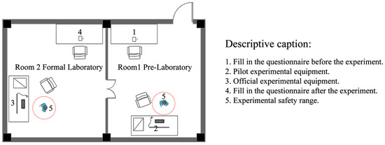 This experiment was conducted in the laboratory of the author’s institution from October to November 2024. As shown in Figure 10, we selected and arranged a laboratory with dimensions of 10 m (length) × 6.4 m (width) × 3.5 m (height). The laboratory is separated by a wall into two single rooms of different sizes, with the larger room serving as the formal laboratory and the smaller room as the pre-laboratory. The equipment and interior design in both rooms were identical to minimize the influence of other factors on the experimental results.