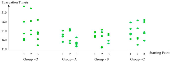 In both Group O and A, the mean evacuation time from Starting Point 1 and 2 was longer than that from Starting Point 3. Most participants in these two groups choose to evacuate from Exit 1 when they departed from Starting Point 1, and most of them evacuated from Exit 3 when they departed from Starting Point 2. For Starting Point 3, participants in Group O mostly evacuated from Exit 1, while participants in Group A mostly chose Exit 3. On the contrary, for Group B and Group C, the average evacuation time was longer for both Starting Point 1 and 3 than for Starting Point 2. Moreover, participants in these two groups basically choose to evacuate through Exit 3, regardless of which Starting Point they departed from. Overall, the data trends of Group B and Group C were consistent, and the data trends of Group O and Group A were similar but different, and this difference was mainly reflected in the evacuation results guided by Starting Point 3.