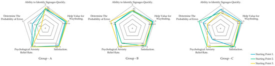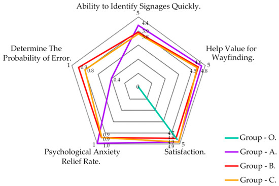 As shown in Figure 12 and Table 6, the researchers objectively recorded the evacuation time (t) of all participants from different Starting Points during the experiment and calculated the average evacuation time across different groups and Starting Points. Table 7 presents the Exit choices of individual participants. As shown in Figure 13 and Figure 14, researchers represented the subjective feelings of different participants by a radar chart. The results showed that, in terms of the average evacuation time values for the four groups, Group O > Group C > Group B > Group A. Among them, the difference between Group O and Group A was the most significant, with an average evacuation time difference of 62 s.