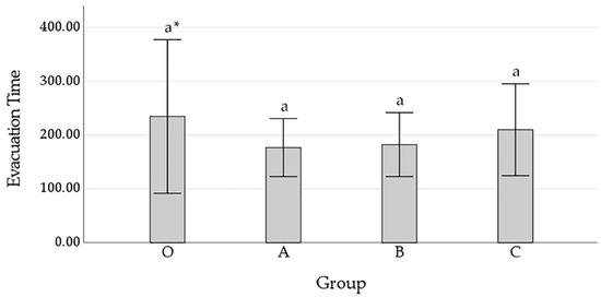 Error Bar Plot of Evacuation Time by Signage Position Groups. a: There was no significant difference in evacuation times between Group A, Group B and Group C. a *: Group O was significantly different from Group A, but not significantly different from Group B and Group C.