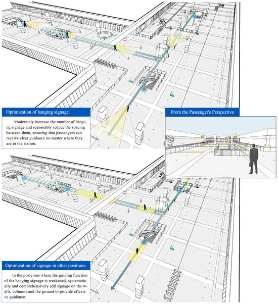Based on the above research results, researchers propose that the practical design of subway station wayfinding systems should prioritize the strategic layout of hanging signage. For example, moderately increase the number of hanging signage and rationally reduce the spacing between signage. With the advantage of a good field of vision, it can effectively avoid being obscured by the crowd, thereby maintaining good visibility in complex passenger flow environments. In areas where the guidance efficiency of hanging signage diminishes, a systematic and comprehensive installation of wall- columned and grounded signage should be installed to relay guidance, thereby forming a multi-dimensional and complementary guidance system, such as Figure 16. It is noteworthy that the specific setting of the hanging signage will need to be dynamically adjusted according to the spatial layout of the subway station and the real-time passenger flow [29,30]. There are significant differences between different subway stations in terms of functional positioning and passenger flow characteristics. Therefore, it is necessary to combine the surrounding facilities of the station to accurately determine the focus of passengers’ attention, and to design and layout hanging signage in a targeted manner to ensure that passengers can quickly capture key information.