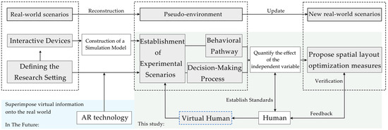 In traditional space research, the adjustment of spatial parameters not only requires substantial time, manpower, and material resources, but also faces challenges in achieving precise control due to susceptibility to interference from external environmental factors. In contrast, VR technology utilizes precise data acquired through field measurements and professional modeling software to construct highly accurate 3D models aligned with real subway stations, thereby creating immersive virtual scenarios with authentic spatial cognition effects. Given the complexity and uniqueness of subway station spatial environments, an increasing number of researchers are inclined to conduct evacuation signage-related studies within immersive virtual environments. During the experiment, researchers often use interaction devices such as eye-trackers and electroencephalographs (EEG) to accurately track participants’ behavioral paths and decision-making processes during evacuation [34,35,36]. This methodology makes it possible to quantify the specific impact of evacuation signage on the efficiency of evacuation under different conditions of visibility and accessibility. With this feature, VR technology provides innovative research ideas and methods for in-depth investigation of passenger wayfinding behavior and optimization of subway station spatial layouts. In light of this, researchers summarized the methodological flow of the application of virtual reality technology in spatial optimization, as shown in Figure 17.