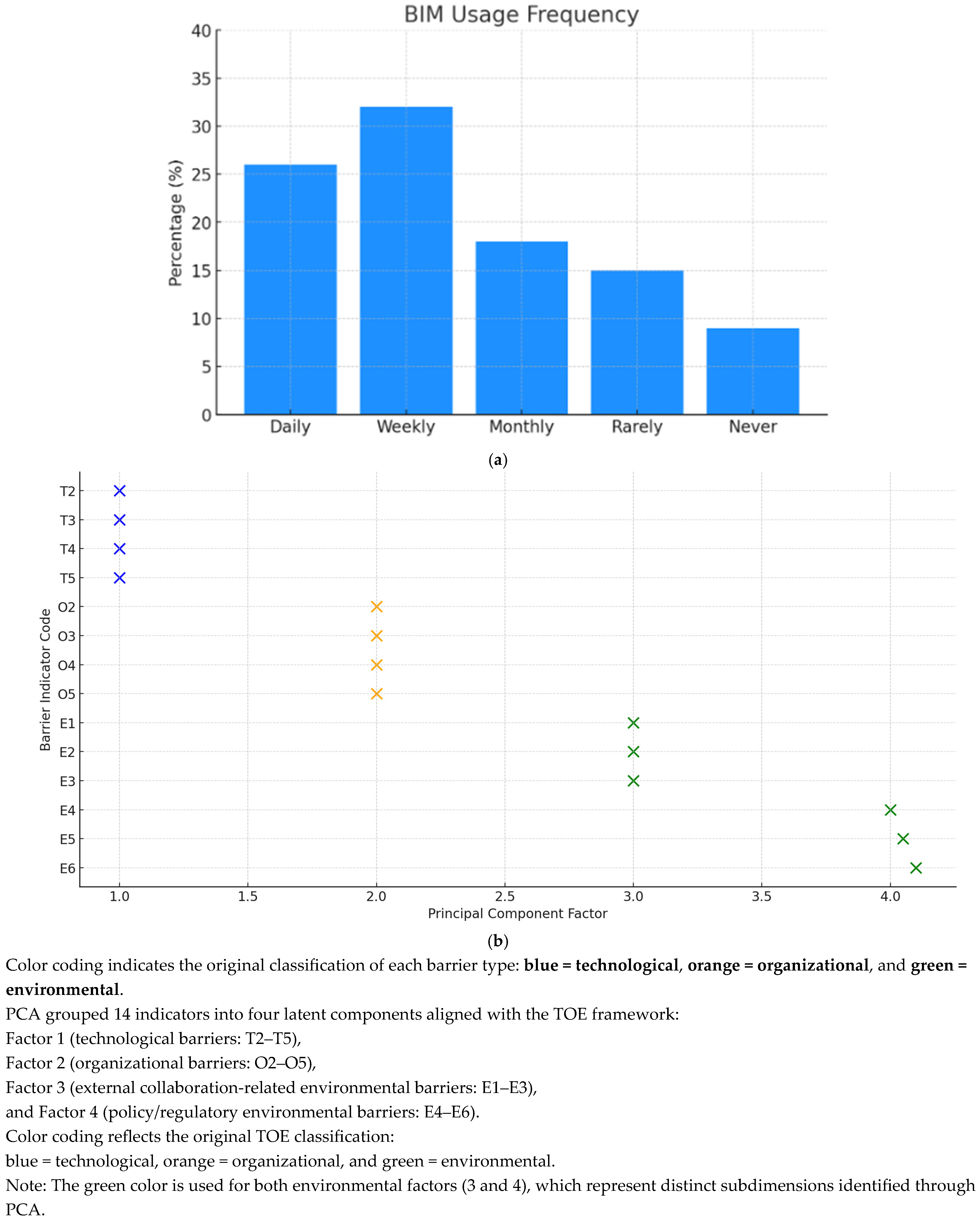 To address research question 4, which explores how technological, organizational, and environmental barriers interact to create complexity in BIM implementation, a multi-step analytical approach was employed. First, an exploratory factor analysis (using PCA with varimax rotation) was conducted to assess whether the survey items align with the TOE framework, i.e., whether they cluster into technological, organizational, and environmental dimensions, or whether alternative groupings emerge. Next, the relationships among the three TOE dimensions were examined through correlation analysis to explore potential interdependencies. Finally, an ordinal logistic regression analysis was performed, with self-reported BIM usage (Q6) as the dependent variable and the composite indices for each TOE dimension as independent variables. The objective was to identify which categories of barriers most significantly influence low levels of BIM adoption in practice. While technological and organizational challenges were evident, they did not fully account for the variation in BIM usage. Instead, external systemic factors—such as regulatory requirements and client-driven demands appeared to function as critical gatekeepers in the implementation process.